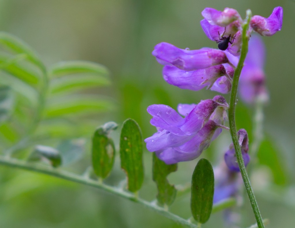 - La Vesce cracca (Vicia cracca) : Plante grimpante aux grappes de fleurs violet-bleu, elle s’accroche aux autres végétaux pour se développer.